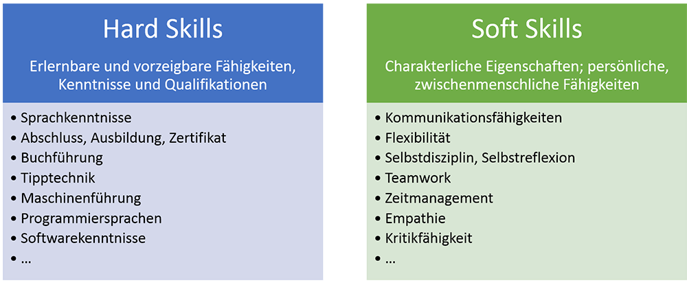 Hard Skills sind all jene Fähigkeiten, die erlernbar und aktiv anwendbar sind. Hard Skills sind typischerweise leicht nachzuweisen oder zu demonstrieren. Im Gegensatz dazu beschreiben die Soft Skills eher Ihre charakterlichen Eigenschaften und Fähigkeiten. Beispiele für Hard Skills sind Sprachkenntnisse, handwerkliche Fähigkeiten, Software- und Programmierkenntnisse und Textsicherheit.