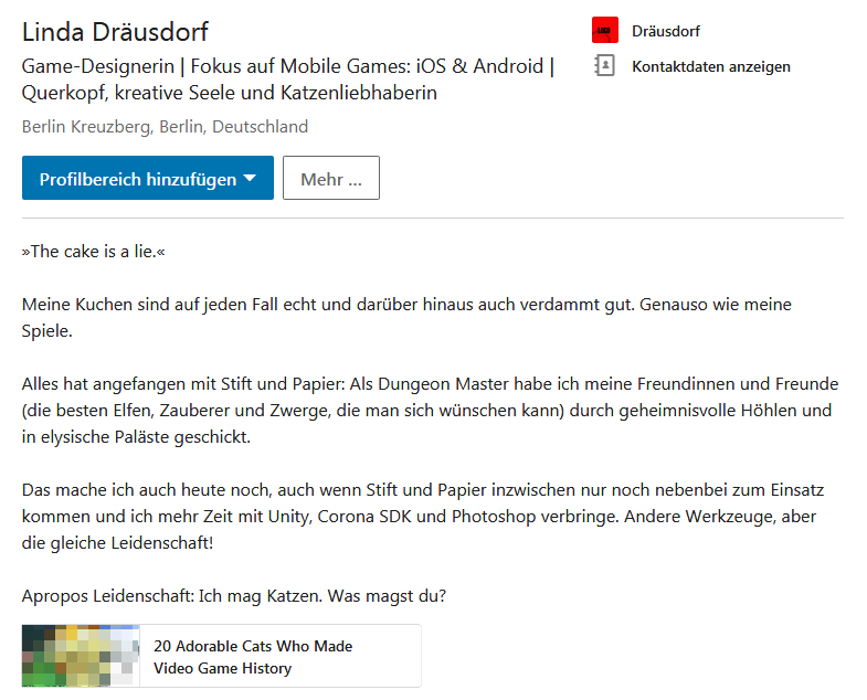 Das erste Beispiel zeichnet sich durch einen sehr sym­pa­thisch wirkenden Text aus. Er ist humorvoll for­mu­liert und verrät mehr über den Charakter der Autorin als über ihre Fä­hig­kei­ten. Dennoch enthält er bran­chen­re­le­van­te Keywords sowohl in der Zu­sam­men­fas­sung als auch im Slogan. Das führt po­ten­zi­el­le Ar­beit­ge­ber, die die Such­funk­ti­on nutzen, schnell auf dies Profil. Denn sucht einer von ihnen bei­spiels­wei­se nach einem Game-Designer, der mit der Unity Engine umgehen kann und für Android pro­gram­miert, dürfte dies LinkedIn-Profil direkt in den Such­tref­fern auf­tau­chen.