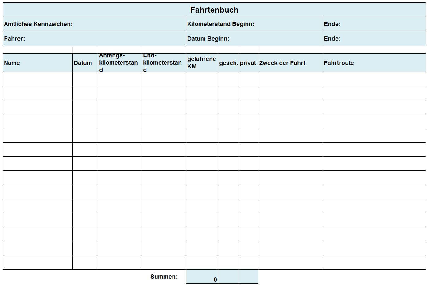 - In den folgenden Zeilen dokumentieren Sie ab jetzt für jede einzelne Fahrt den Namen des Fahrers, das Datum, den Kilometerstand am Anfang und am Ende der Fahrt sowie die insgesamt zurückgelegte Distanz. Weiterhin geben Sie an, ob es sich um eine geschäftliche oder private Fahrt gehandelt hat und welchem Zweck sie diente. Bei Umwegen kann es zudem sinnvoll sein, die Fahrtroute näher zu erläutern.