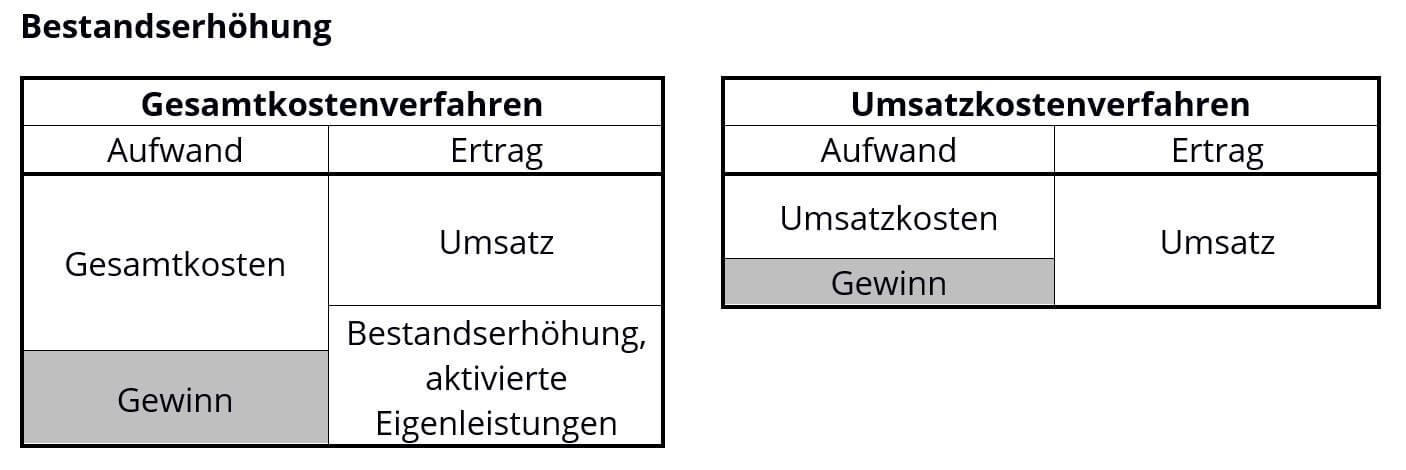 Bestandserhöhungen an fertigen oder unfertigen Waren werden zu den Umsatzerlösen addiert, Bestandsminderungen dementsprechend abgezogen. Folglich können Bestandsveränderungen im Gesamtkostenverfahren sowohl auf der Aufwands- als auch der Ertragsseite stehen.