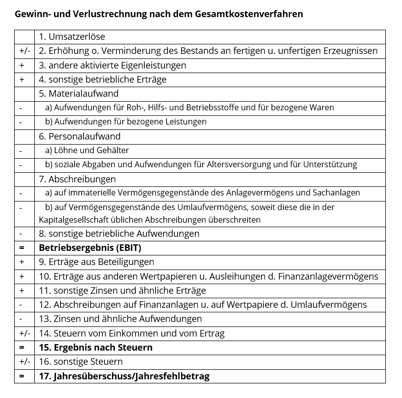 Der § 275 HGB legt für die GuV nach dem Gesamtkostenverfahren ein Schema mit sämtlichen Posten fest, die in die Berechnung einfließen müssen: