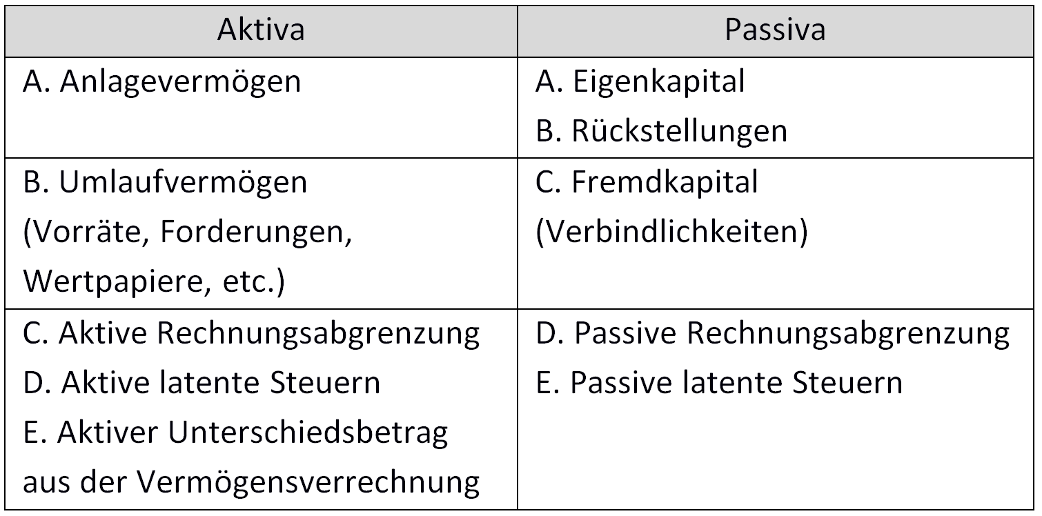 Gemäß § 242 Abs. 1 HGB ist eine Bilanz eine stichtagsbezogene Gegenüberstellung des Vermögens und der Schulden eines Unternehmens. Dabei ist die Bilanz aufgeteilt in eine Aktiv- und eine Passivseite. Auf der linken, der Aktivseite, auch „Aktiva“ genannt, wird das Vermögen des Unternehmens aufgezeigt, sie gibt Auskunft über die Wertverwendung. Auf der rechten, der Passivseite, auch „Passiva“ genannt, wird im Wesentlichen das Eigen- und Fremdkapital des Unternehmens aufgeführt und die Mittelherkunft erfasst. Wichtig dabei ist, dass die Summe der Aktiva immer der Summe der Passiva entspricht.