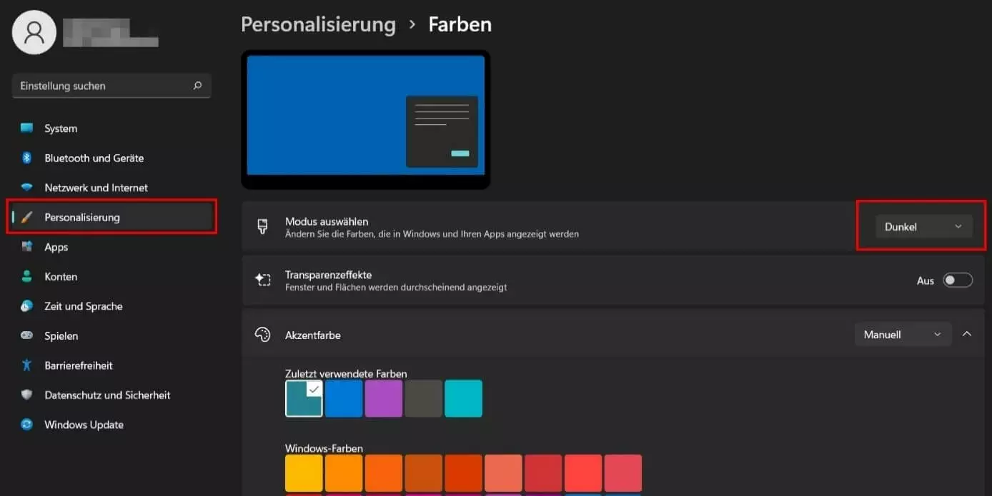 Manuelle Aktivierung des Dunkelmodus