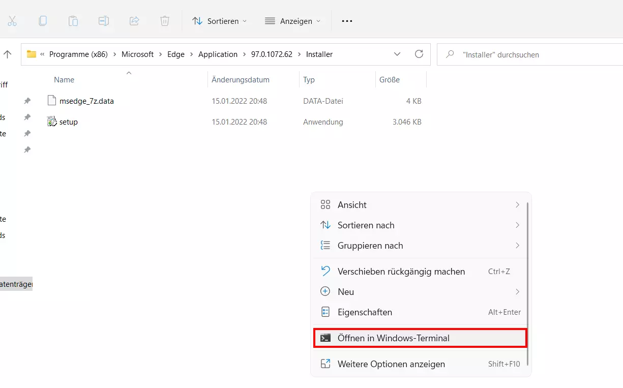 Schritt 2: Öffnen Sie nun den darin befindlichen Ordner „Installer“. Halten Sie dann die [Shift]-Taste gedrückt und klicken Sie mit der rechten Maustaste auf einen leeren Bereich des Explorer-Fensters. Im aufklappenden Kontextmenü wählen Sie nun „PowerShell-Fenster hier öffnen“ bzw. „Öffnen in Windows-Terminal“.