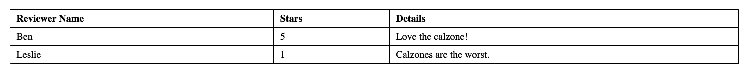 INSERT INTO user_review (reviewer_name, star_rating, details) VALUES ('Leslie', '1', 'Calzones are the worst.');
