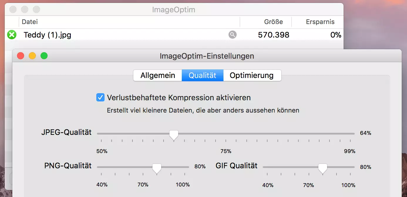 Wenn Sie die Bilder und Fotos Ihres Webprojekts komprimieren möchten und ein Open-Source-Tool für macOS benötigen, ist das von Kornel Lesinski entwickelte ImageOptim zu empfehlen. Das GPL-lizenzierte Programm kombiniert eine Handvoll Bildoptimierungstools, z. B. MozJPEG, pngquant und SVGO, und ermöglicht auf diese Weise nicht nur das Entfernen unwichtiger EXIF-Metadaten, sondern auch die generelle Komprimierung von Bild- und Fotomaterial verschiedenster Art (JPEG, SVG, GIF, PNG).