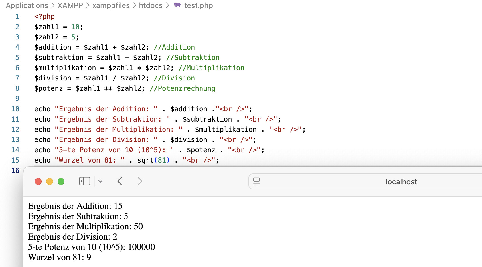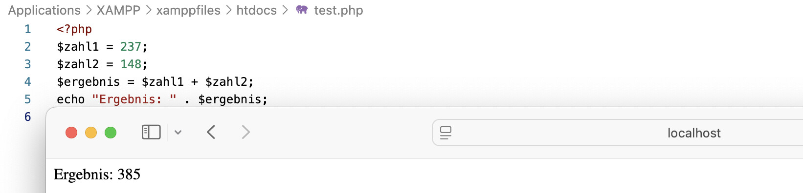Speichern Sie die Textdatei unter dem Namen test im Format .php (PHP-Skript) ab und starten Sie Ihren Webserver. Sofern Sie die Testumgebung XAMPP nutzen, legen Sie test.php im XAMPP-Verzeichnis unter htdocs ab (C:\xampp\htdocs).