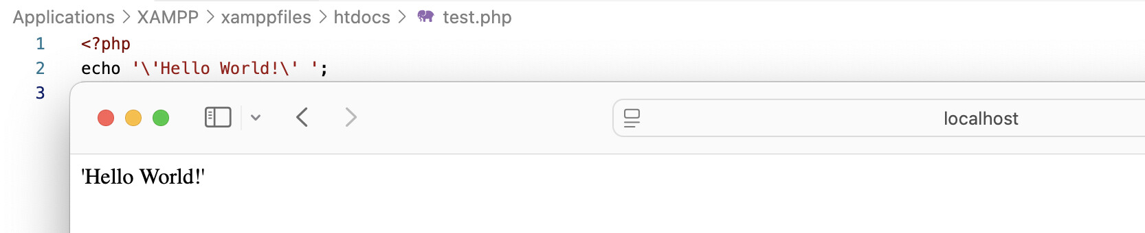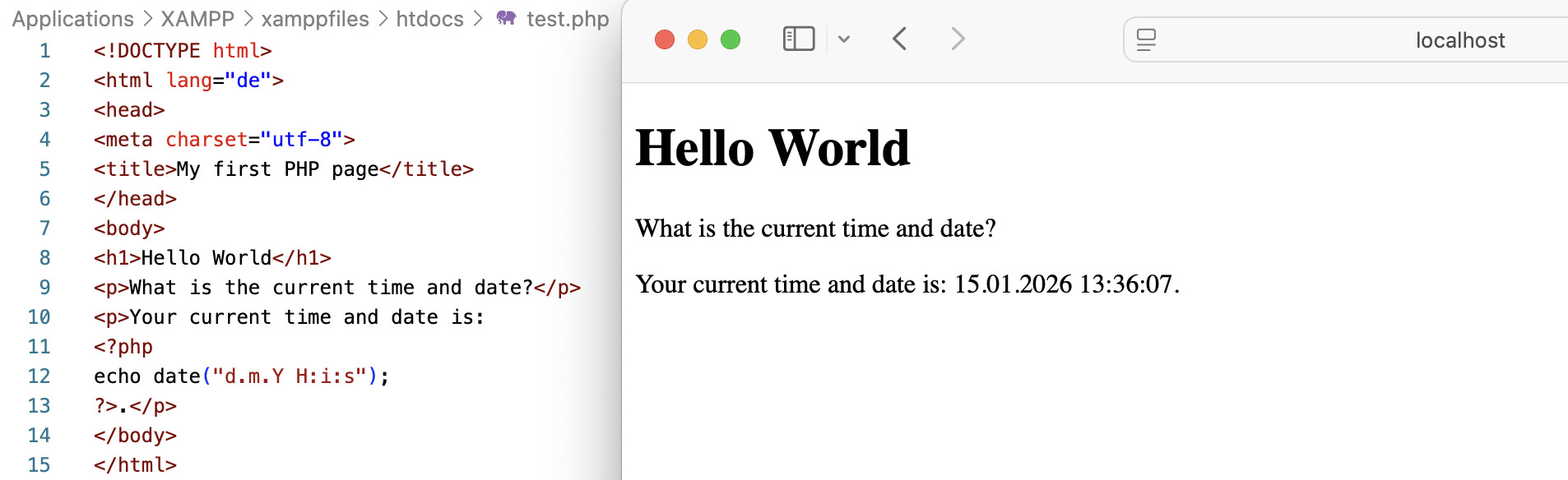 Die Beispieldatei lässt sich nun über folgende URL im Webbrowser aufrufen: ‘http://localhost/test.php’. Verwenden Sie einen anderen Webserver oder eine individuelle Konfiguration der XAMPP-Software, wählen Sie die URL dem jeweiligen Dateipfad entsprechend.