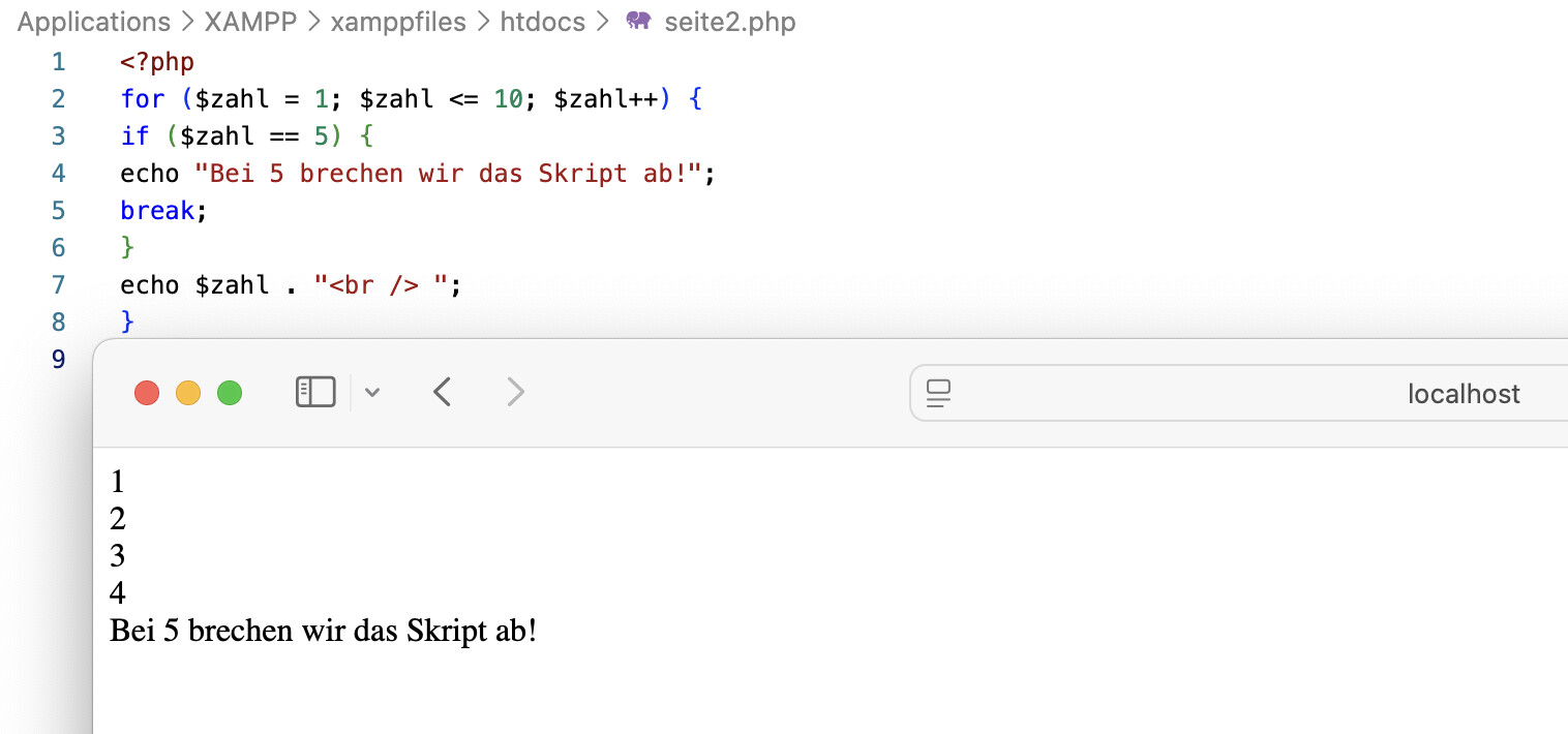 ?>phpIn der for-Schleife haben wir definiert, dass der Wert der Variable $zahl ausgehend von einem Startwert 1 in jeder Schleifenrunde um den Wert 1 erhöht werden soll, bis die Variable den Wert 10 erreicht hat. Diese Schleife stoppen wir nun vorzeitig mit der Anweisung break, sobald $zahl den Wert 5 erreicht hat. Das Sprachkonstrukt echo gibt somit lediglich die Zahlen 1 bis 4 aus.