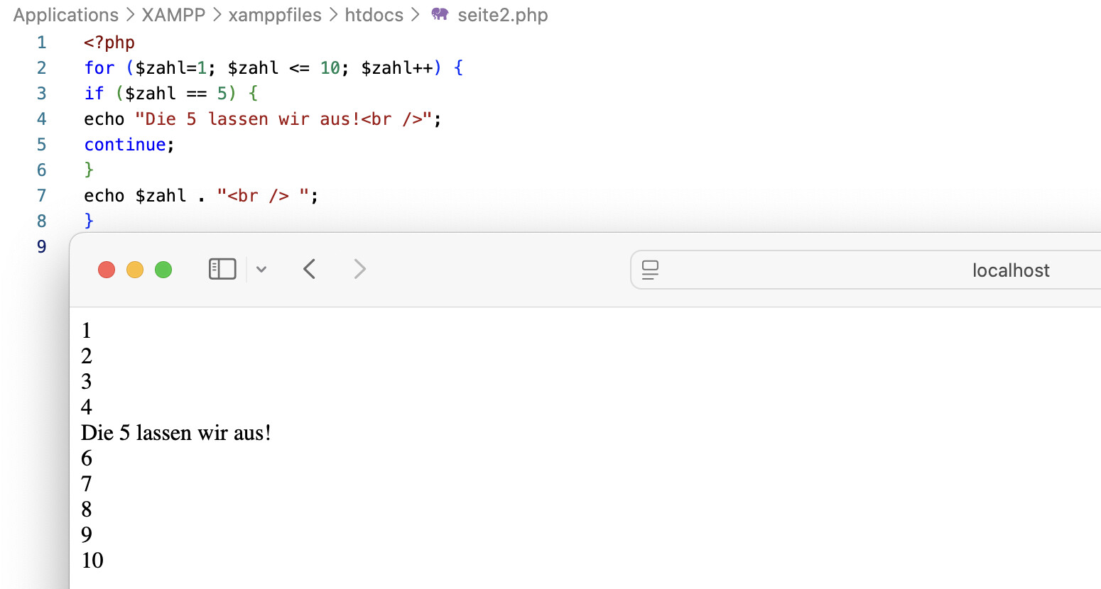 Möchten wir lediglich die die Ausgabe der fünften Runde überspringen, nicht jedoch den gesamten Schleifenablauf stoppen, ersetzen wir die Anweisung break durch continue: