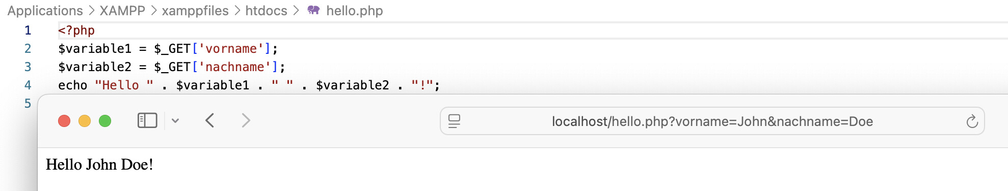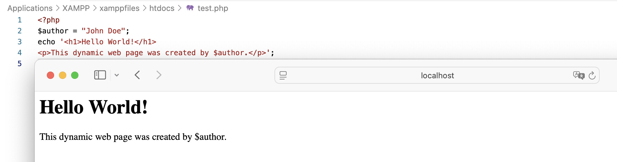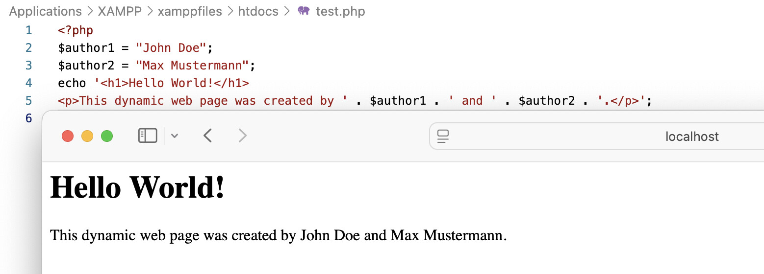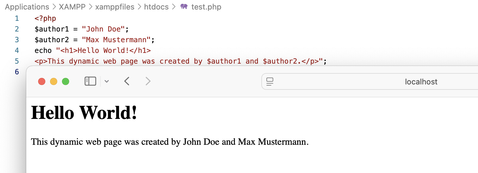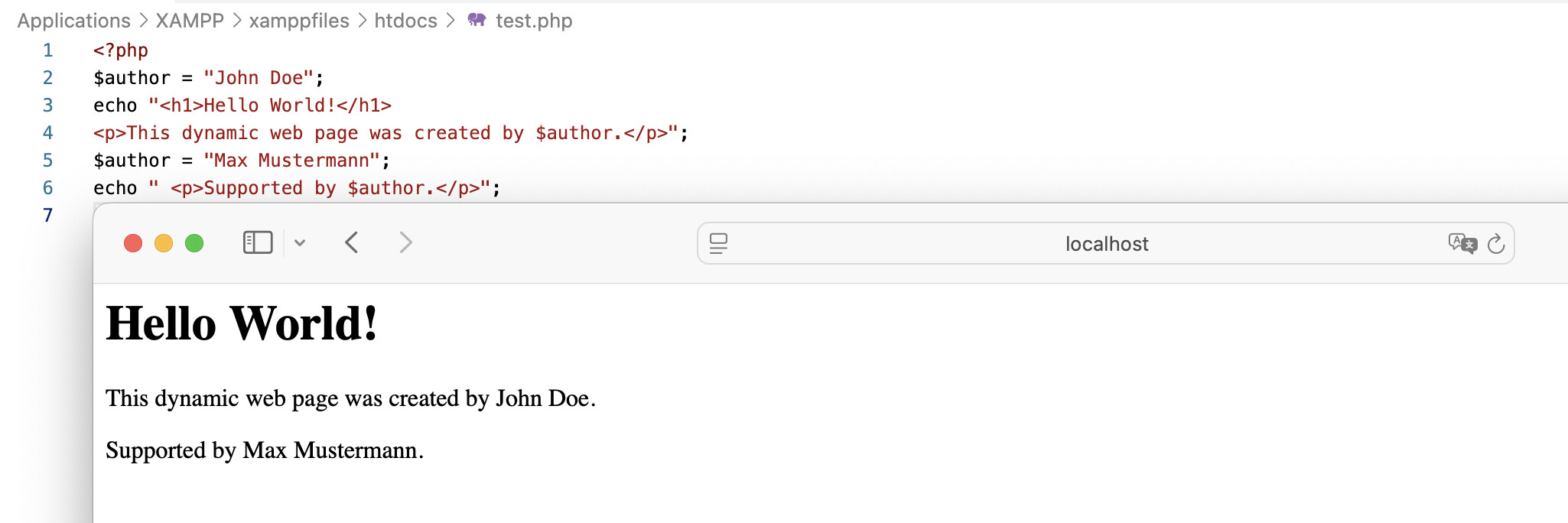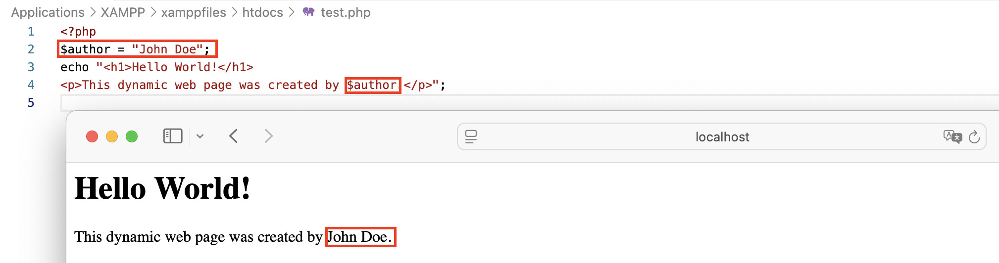 ?>phpAuf das öffnende PHP-Tag folgt die Definition der Variable: Für $author soll der Wert John Doe verwendet werden. Bei der Skriptausführung wird die Variable $author somit bei jeder Nennung innerhalb der Skript-Umgebung durch den Wert John Doe ersetzt. Wie das im Webbrowser aussieht, zeigt die nachstehende Grafik.