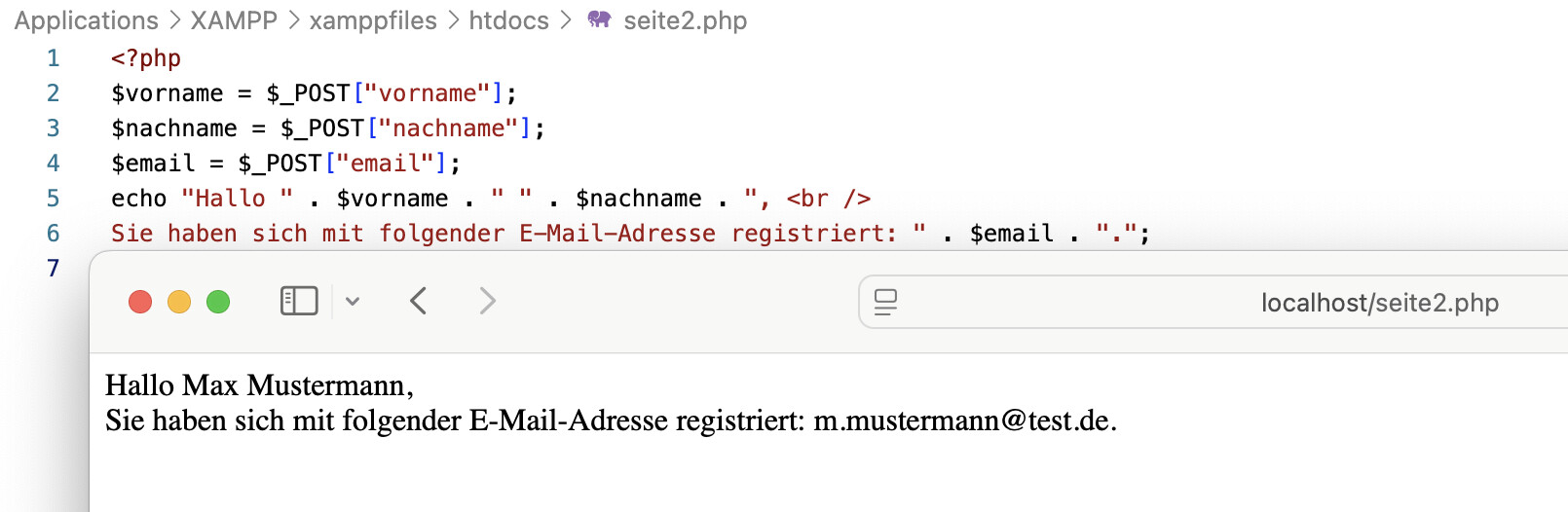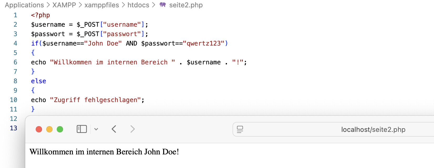 ?>phpUnser Skript seite2.php bekommt nun die Werte für usernameundpasswort übergeben und speichert diese in den Variablen $usernameund*$passwort*. Die expression des if-Konstrukts enthält nun zwei Bedingungen, die mit dem logischen Operator AND verbunden sind. Nur wenn beide Bedingungen erfüllt sind (username==“John Doe”und$passwort==“qwertz123”), gibt if das Ergebnis TRUE zurück.