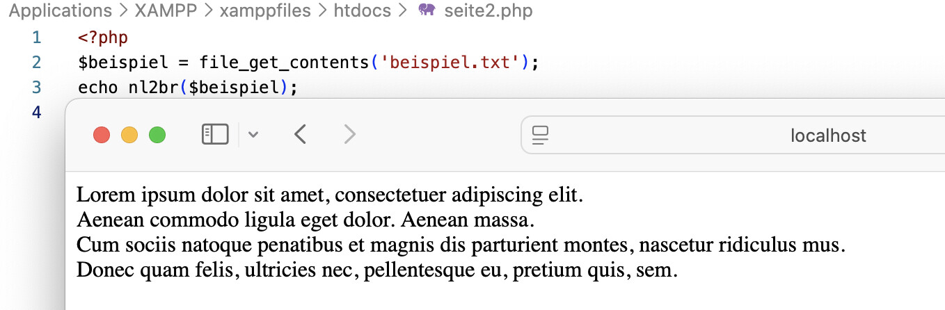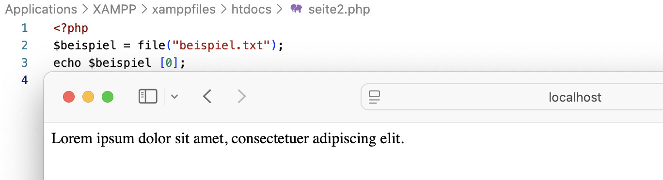 Wir demonstrieren die PHP-Dateioperationen an der Textdatei beispiel.txt, die wir im Ordner htdocs unseres Testservers ablegen. Inhalt der Datei sind vier Zeilen Blindtext: