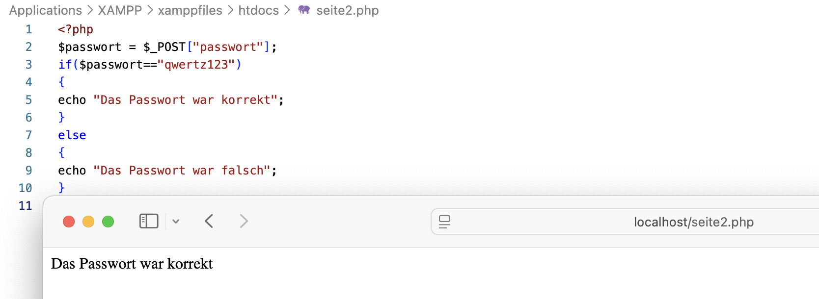 Der Webbrowser leitet uns automatisch auf seite2.php um. Im Hintergrund gleicht die if-Kontrollstruktur unsere Eingabe mit dem hinterlegten Passwort ab und kommt zu dem Ergebnis „qwertz123 == qwertz123 ist TRUE“ und gibt den String Das Passwort war korrekt aus.