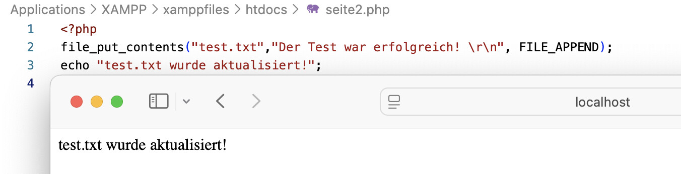 Wir nutzen dazu die PHP-Funktion file_put_contents(). Diese erwartet zwei Parameter: Den Namen der Datei, die erstellt oder aktualisiert werden soll, sowie die Daten in Form eines Strings oder Arrays. Folgendes Skript erstellt die Datei test.txt und schreibt den String Das ist ein Test! in die erste Zeile. Der Zusatz \r\n führt zu einem Zeilenumbruch in der Zieldatei.
