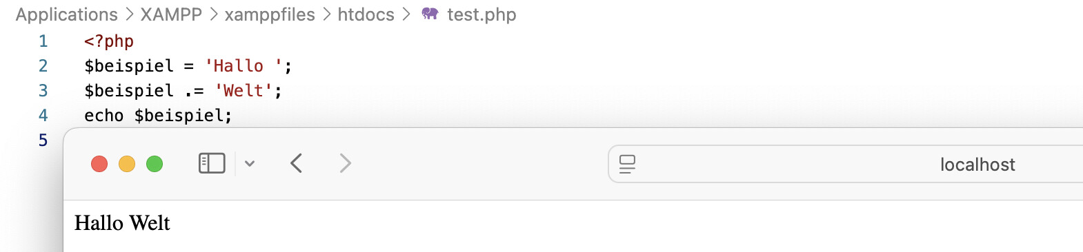Arbeiten wir mit Variablen, haben wir es somit immer mit mehreren Elementen zu tun, die bei der Ausgabe miteinander verkettet werden müssen. In PHP kommt dazu der Verkettungsoperator (.) zum Einsatz.