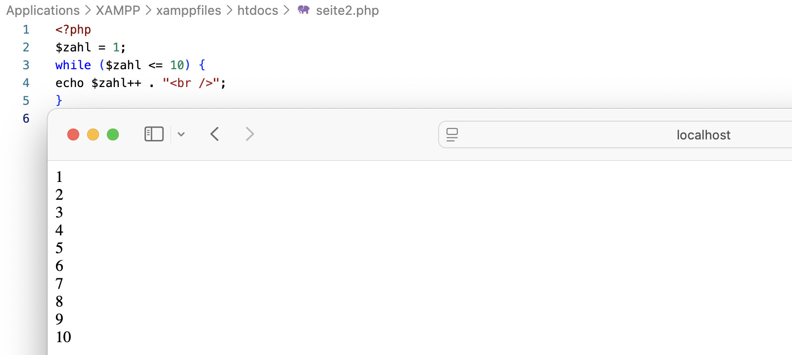 ?>Im Abschnitt „Rechnen mit Variablen“ wurde das Prinzip des Inkrementierens eingeführt. In folgendem Skript greifen wir darauf zurück, nutzen diesmal jedoch einen Post-Inkrement-Operator, um den Wert der Integer-Variable $zahl pro Schleifendurchgang erst nach der Textausgabe via echo um 1 zu erhöhen. Als Bedingung für die while-Schliefe definieren wir: $zahl größer/gleich 10. Die Anweisung echo wird somit so lange wiederholt, bis die $zahl einen Wert größer 10 angenommen hat.