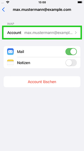 Wenn eine abweichende E-Mail-Adresse eingetragen ist, müssen Sie die korrekte E-Mail-Adresse hinzufügen. Anschließend müssen Sie die abweichende E-Mail-Adresse in den Einstellungen löschen. Um die E-Mail-Adresse einzutragen, die Sie bei der Einrichtung des E-Mail-Postfachs erstellt haben, tippen Sie auf Weitere E-Mail-Adresse… .