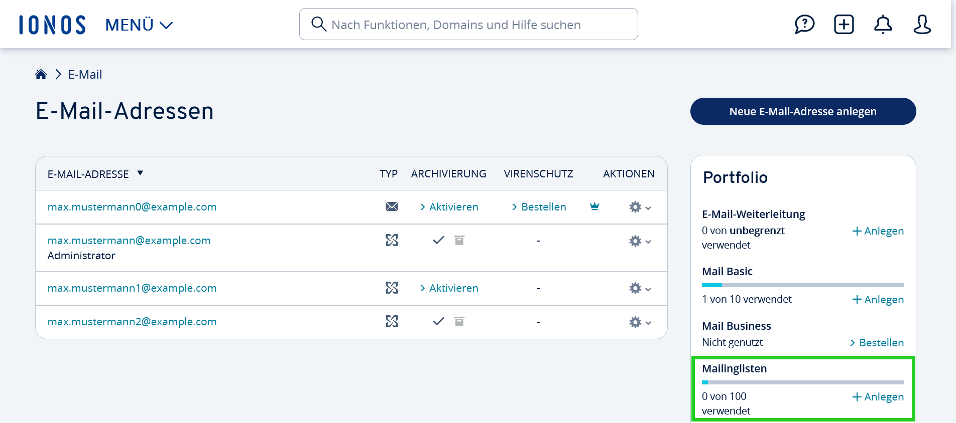 - Klicken Sie auf der Seite E-Mail-Adressen rechts in der Portfolio-Kachel unter Mailinglisten auf Anlegen.